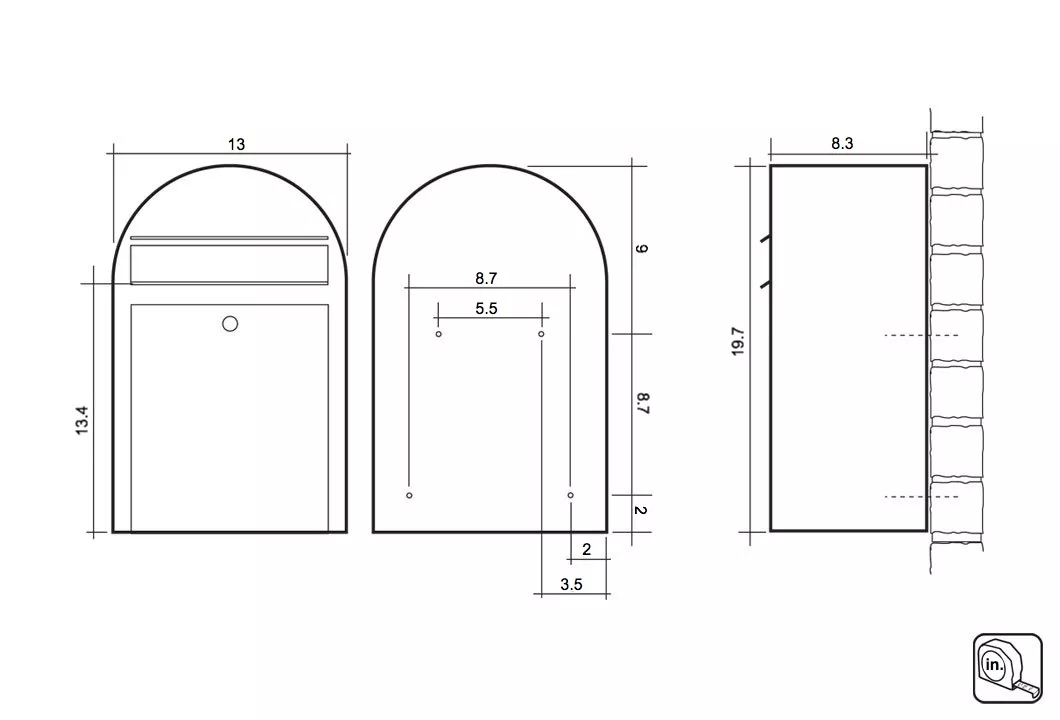 | Mailbox | 19.7" | 12.6" | 8.3" |