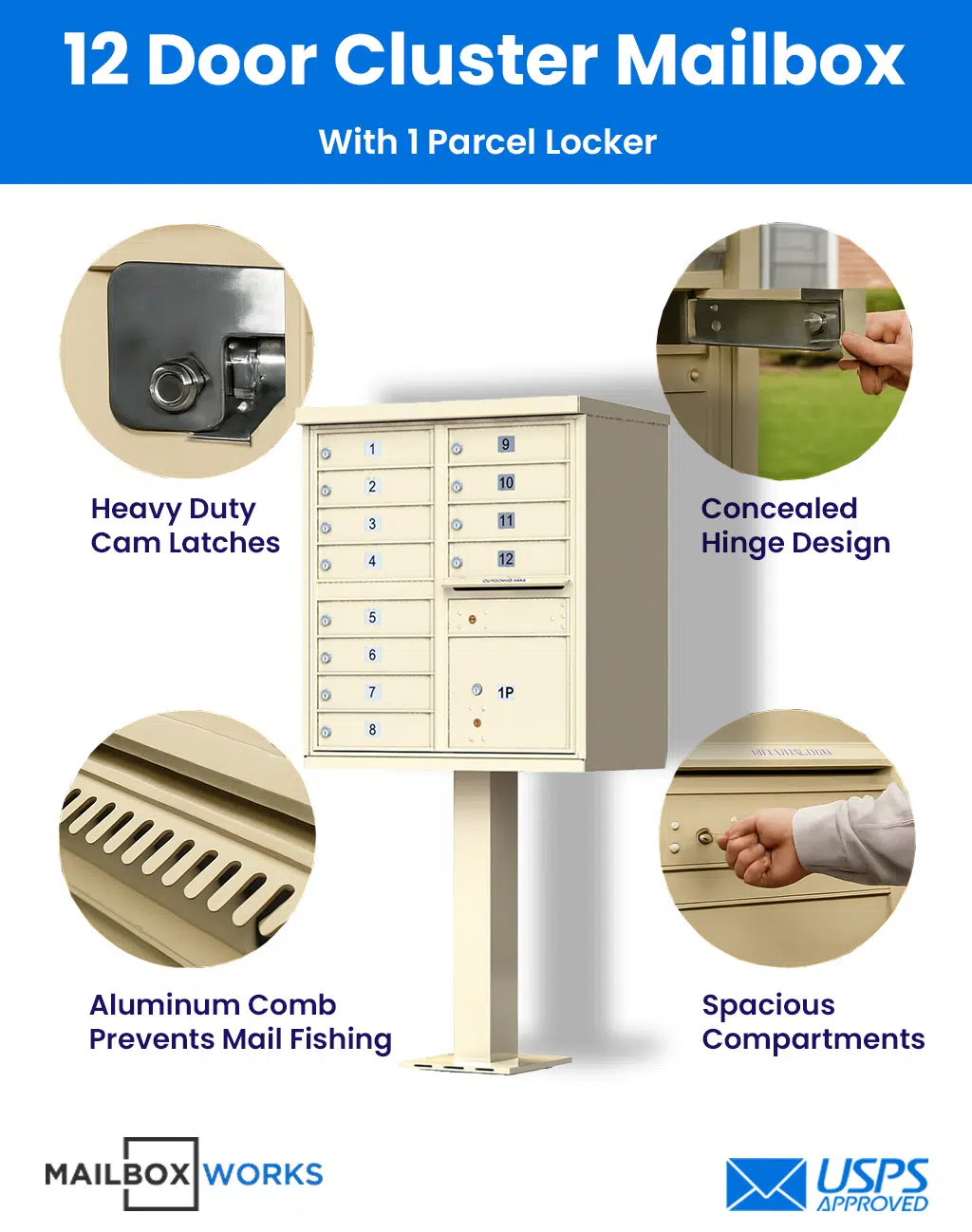 - Crafted of heavy-duty aircraft-grade aluminum and stainless steel hinges, these 12-door cluster mailboxes come with 3 keys per compartment door, a shielded outgoing mail receptacle, and 1 parcel locker.