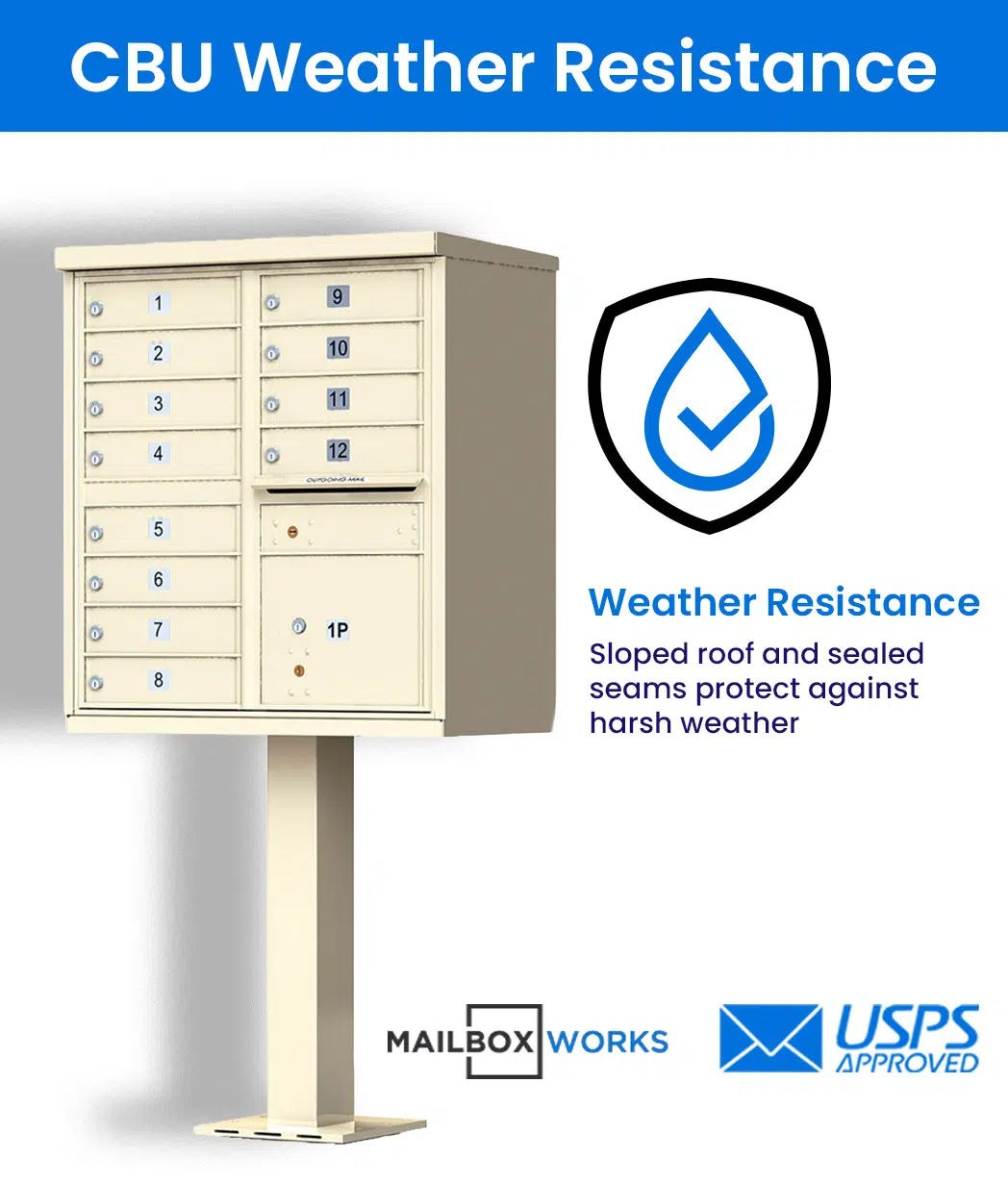 - Finished with a weather-proof powder coating that resists scratching, erosion, dents, and peeling to retain the aesthetic appeal of your CBU mailbox.