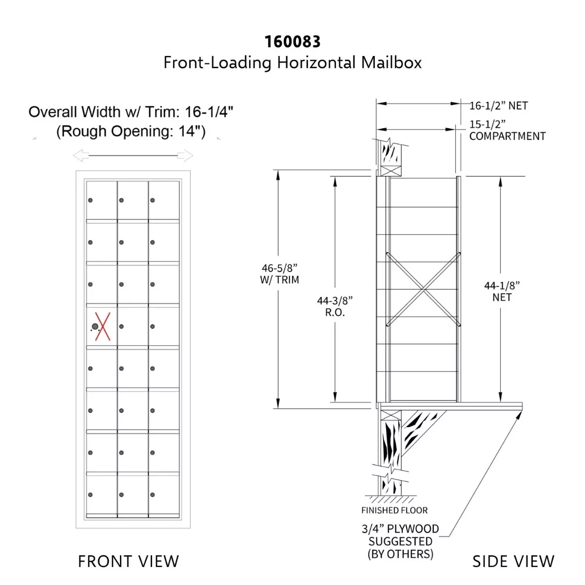 | Rough Opening | 44.4375" | 14" | 17" |