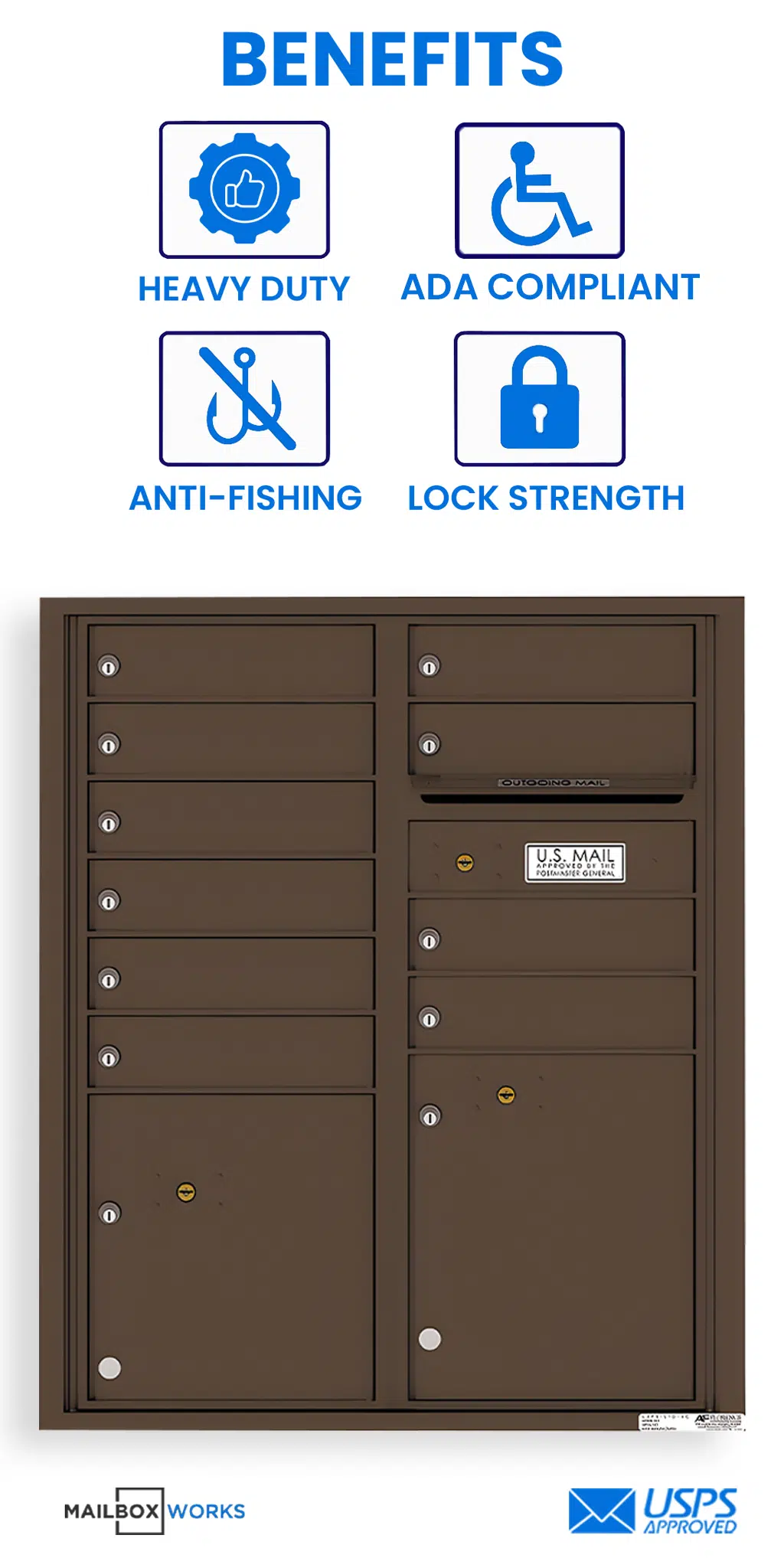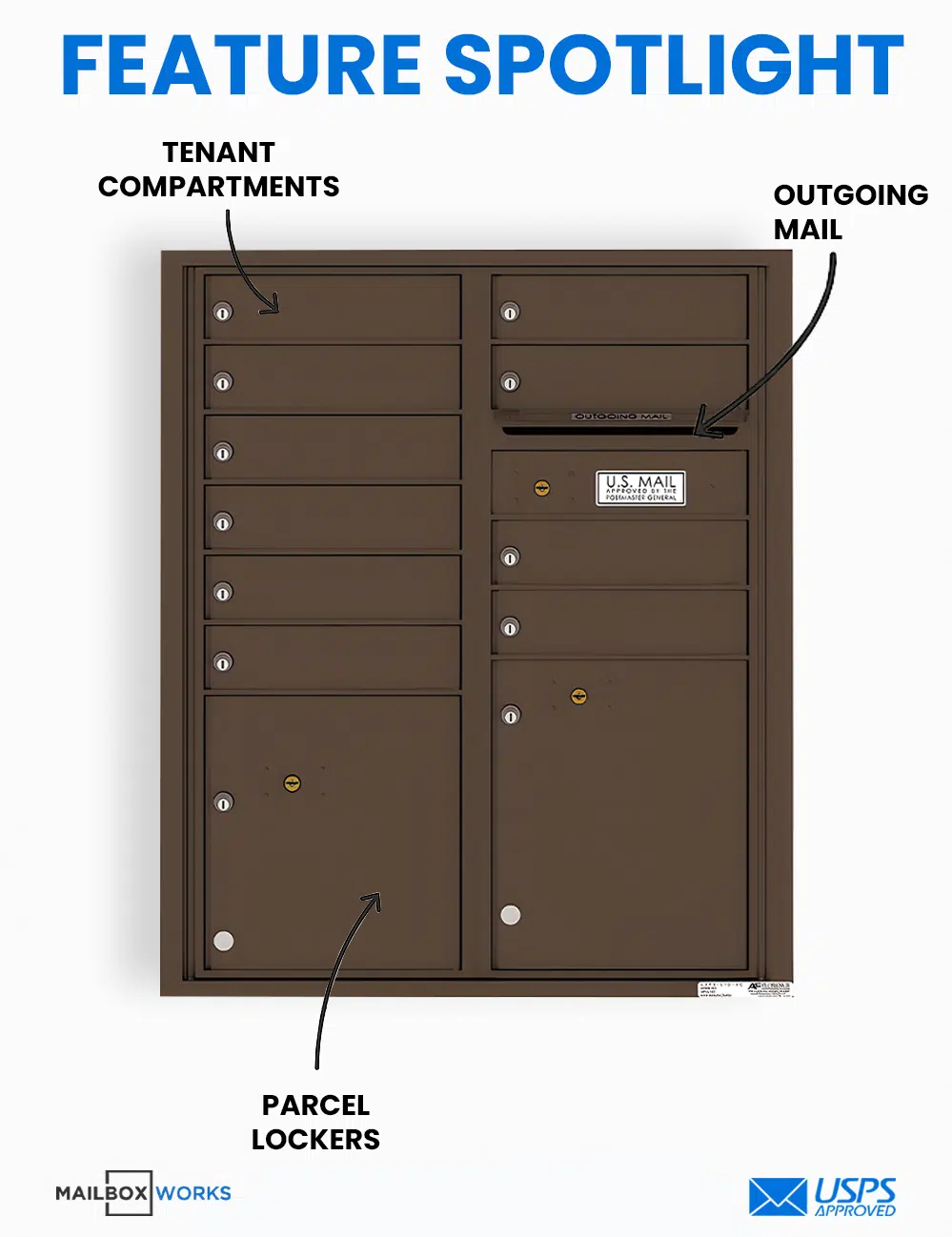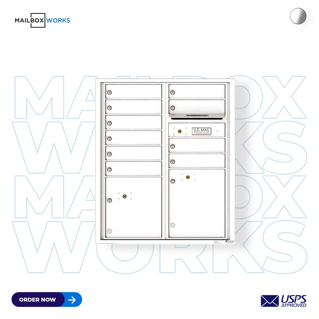 - Includes: Mailbox, Tenant Door Locks With 3 Keys Each, 10 Tenant Compartments, 2 Parcel Compartments, Outgoing Mail Slot