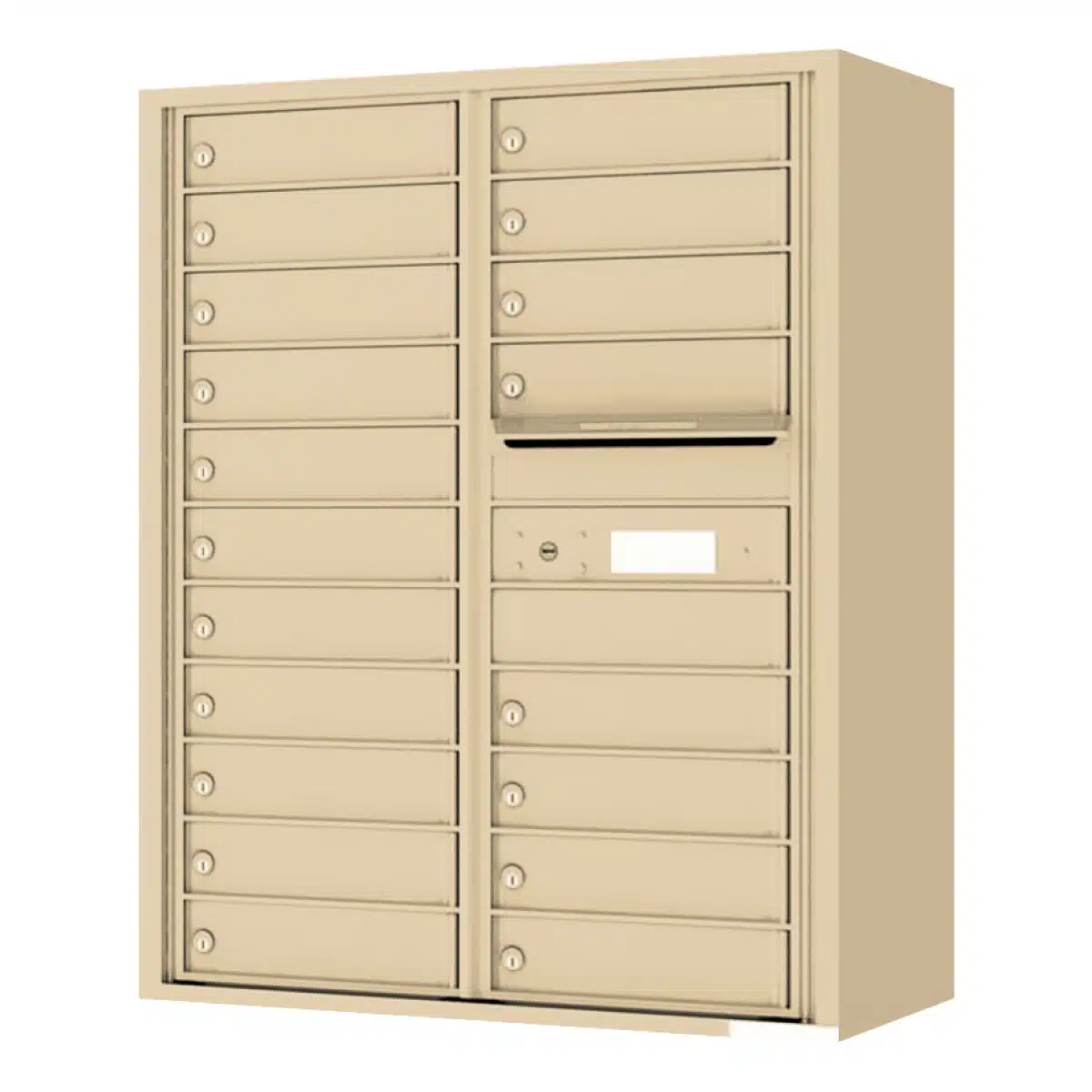 - This front-loading unit features 19 tenant doors and 0 parcel lockers