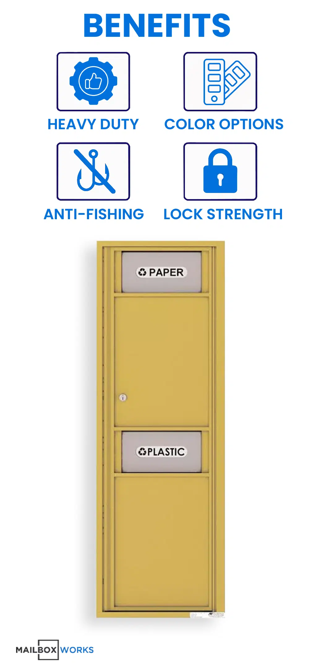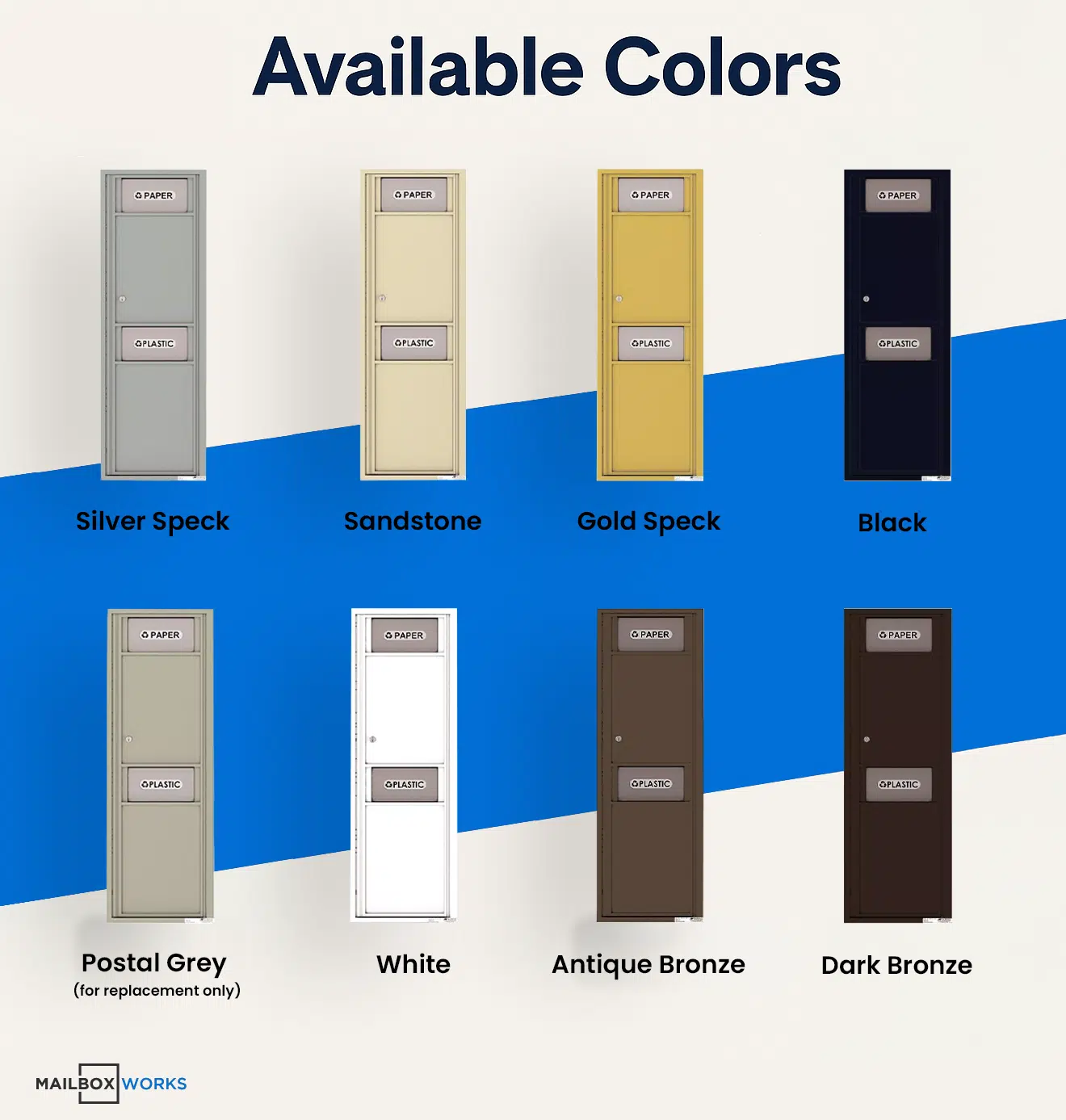 - Pre-printed standard door flap decals: WASTE, TRASH, PLASTIC*, GLASS*, or PAPER* (*Plastic, Glass, and Paper include recycling symbol)