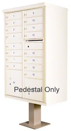 - The pedestal is 14″ high and is for 13 and 16 door CBU mailboxes
