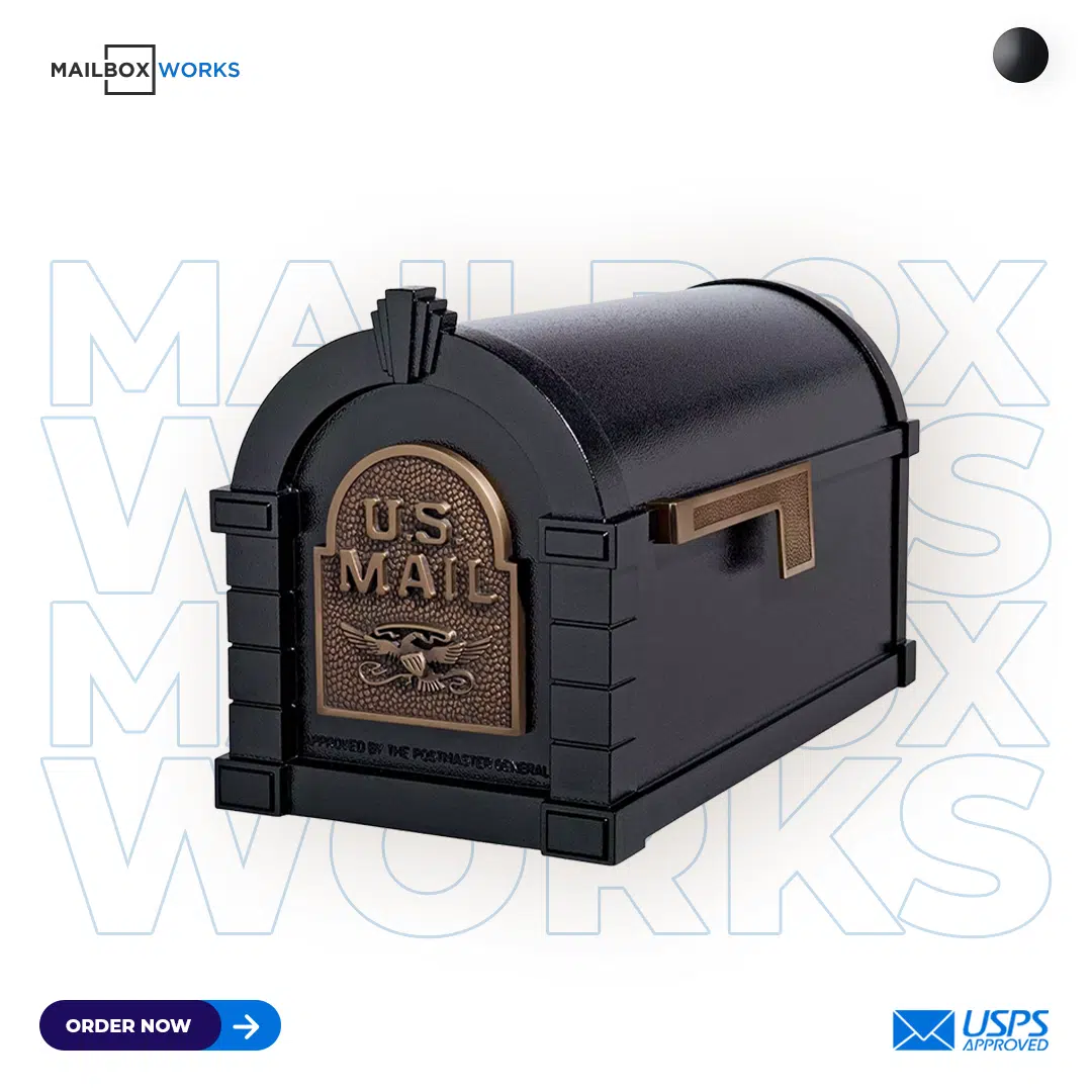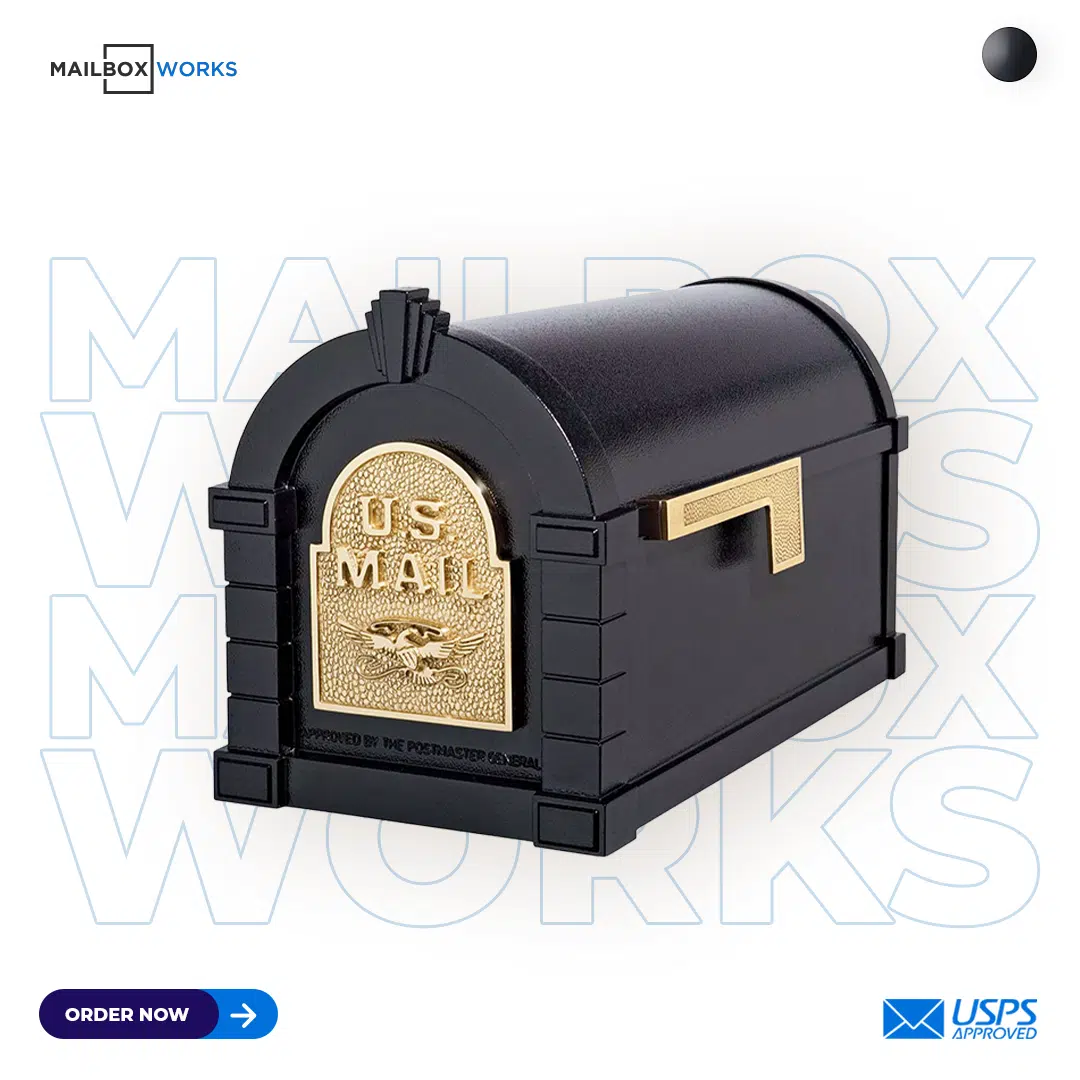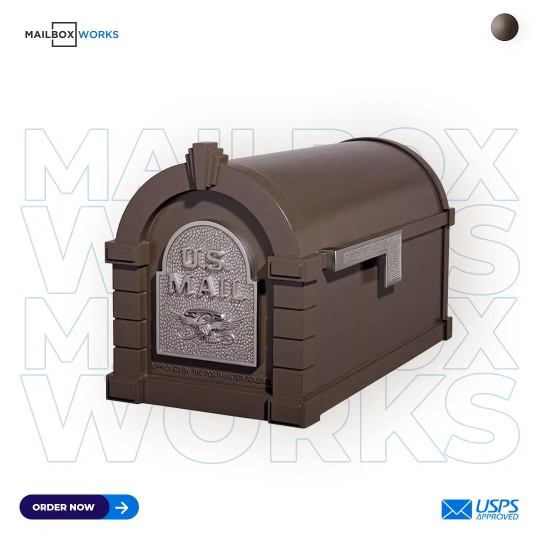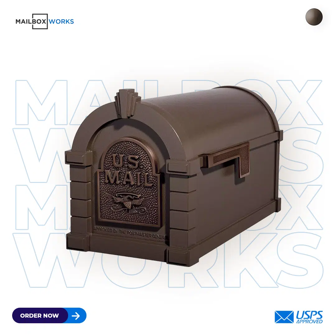 - The Gaines Keystone mailbox, shown in metallic bronze with polished brass, is one of our best selling decorative mailboxes