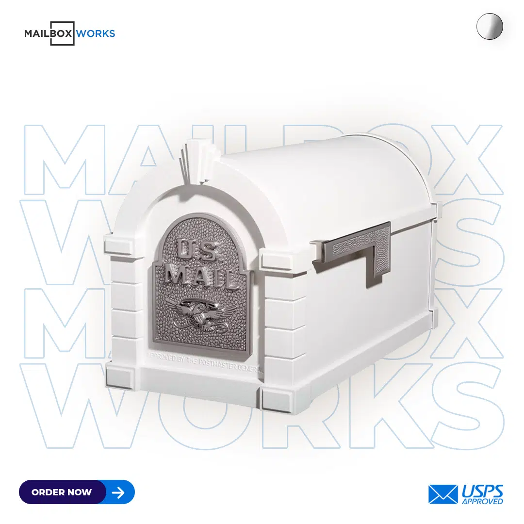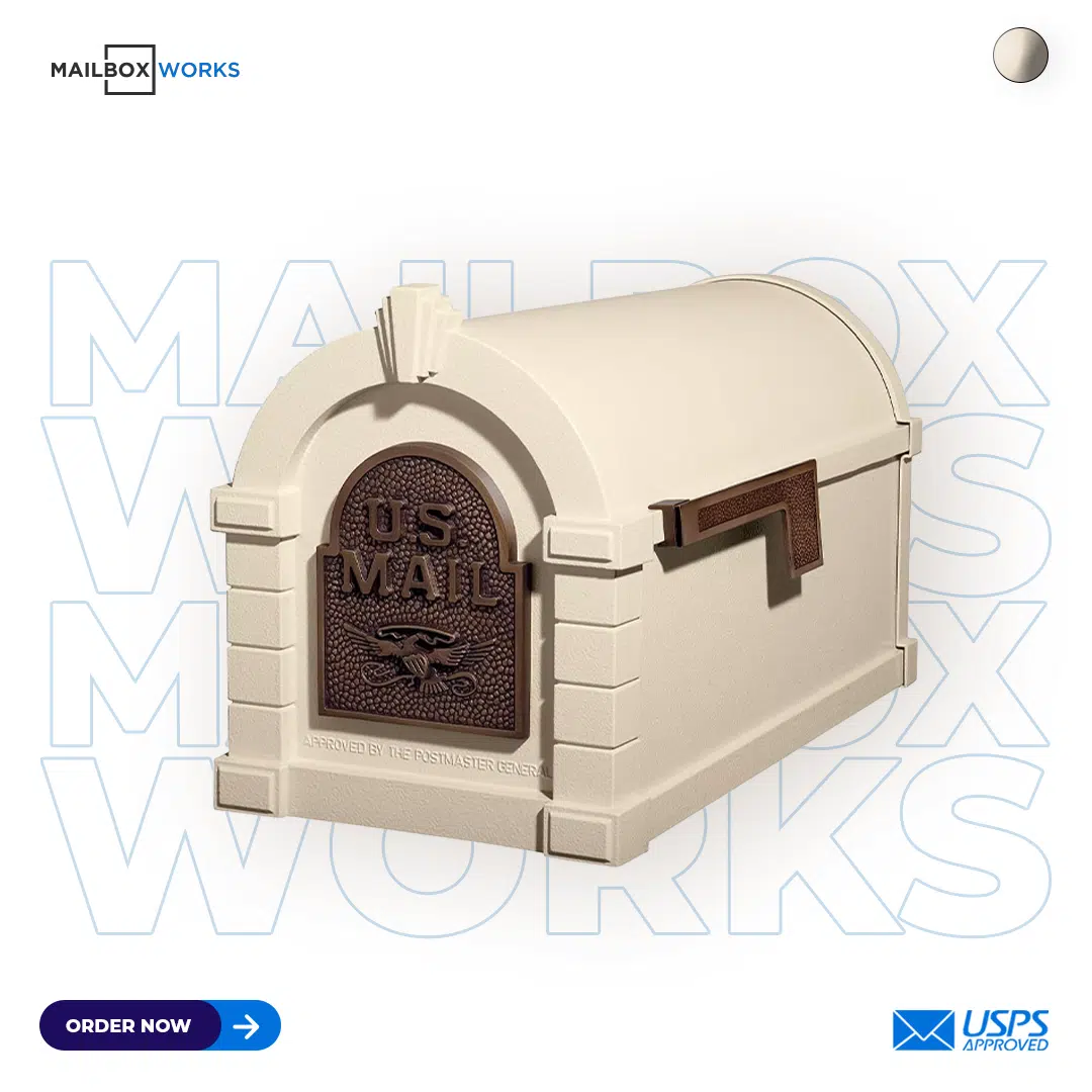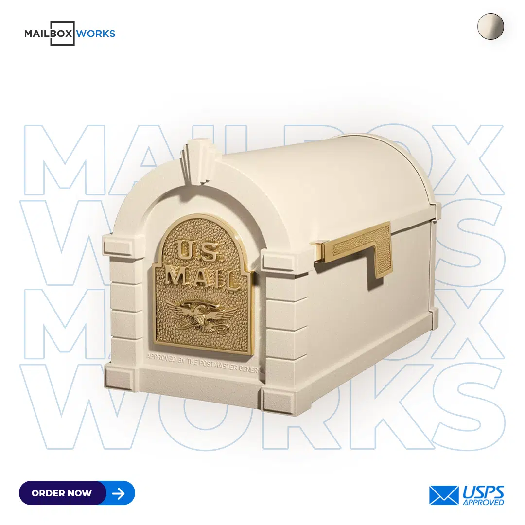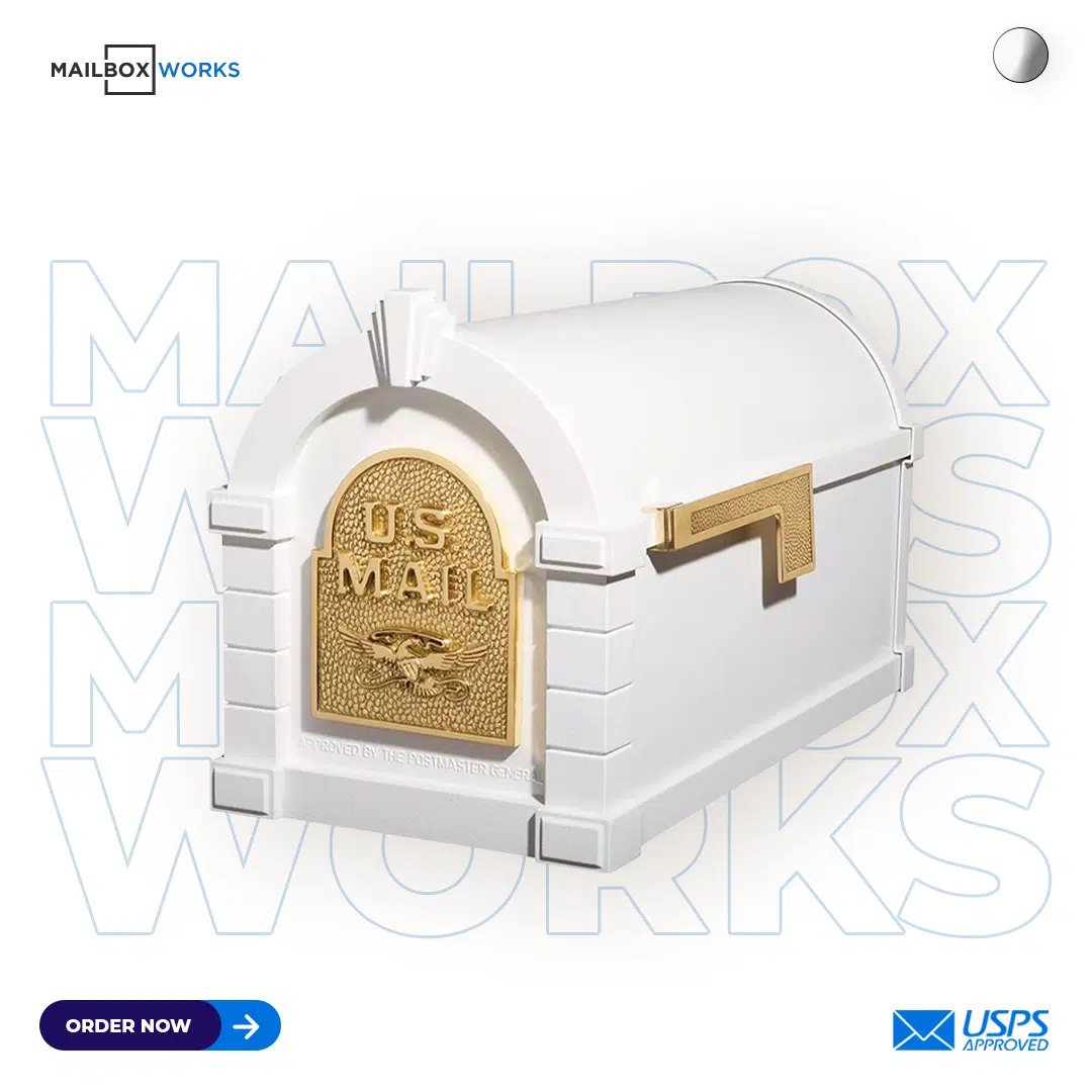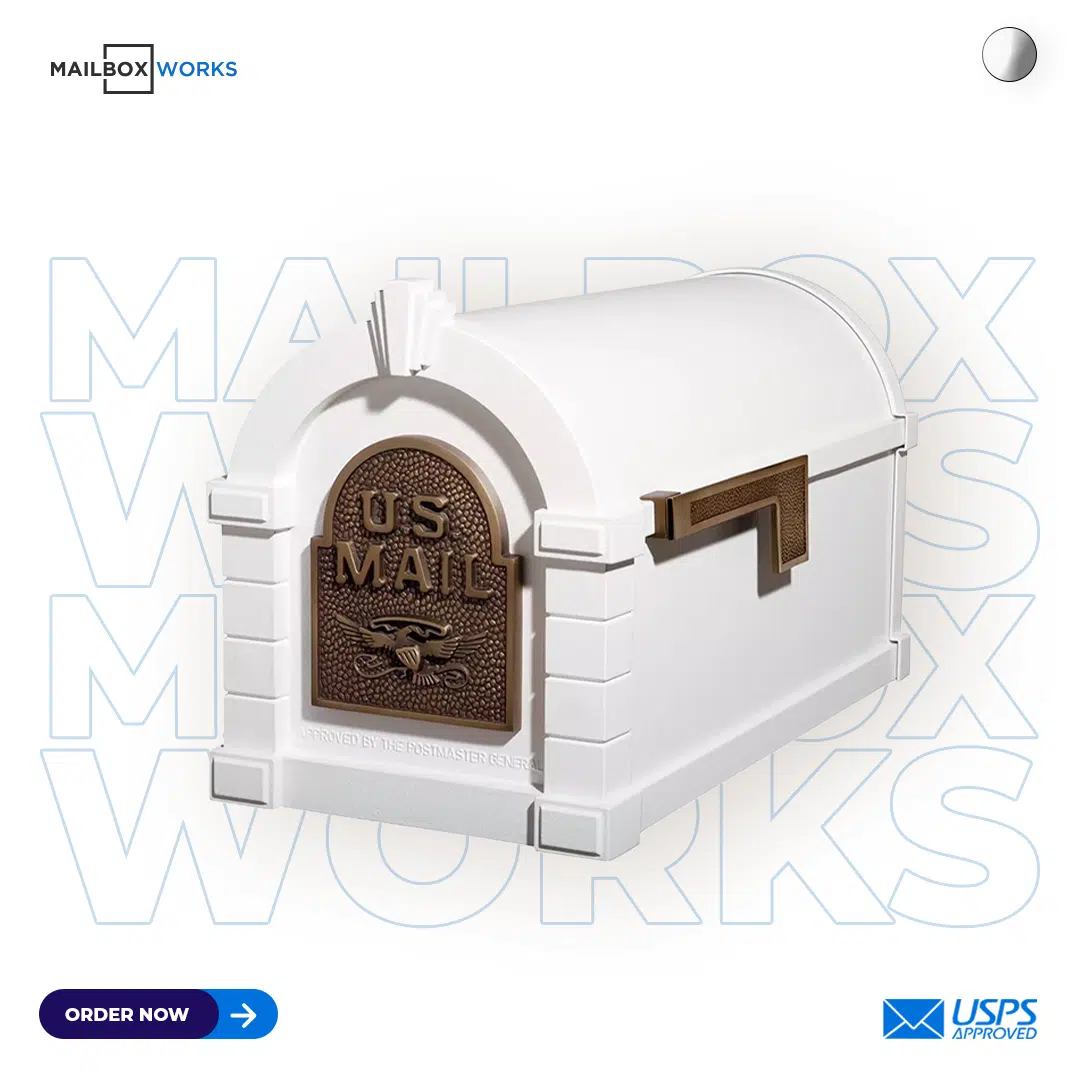 - The Gaines Keystone mailbox, shown in metallic bronze with polished brass, is one of our best selling decorative mailboxes