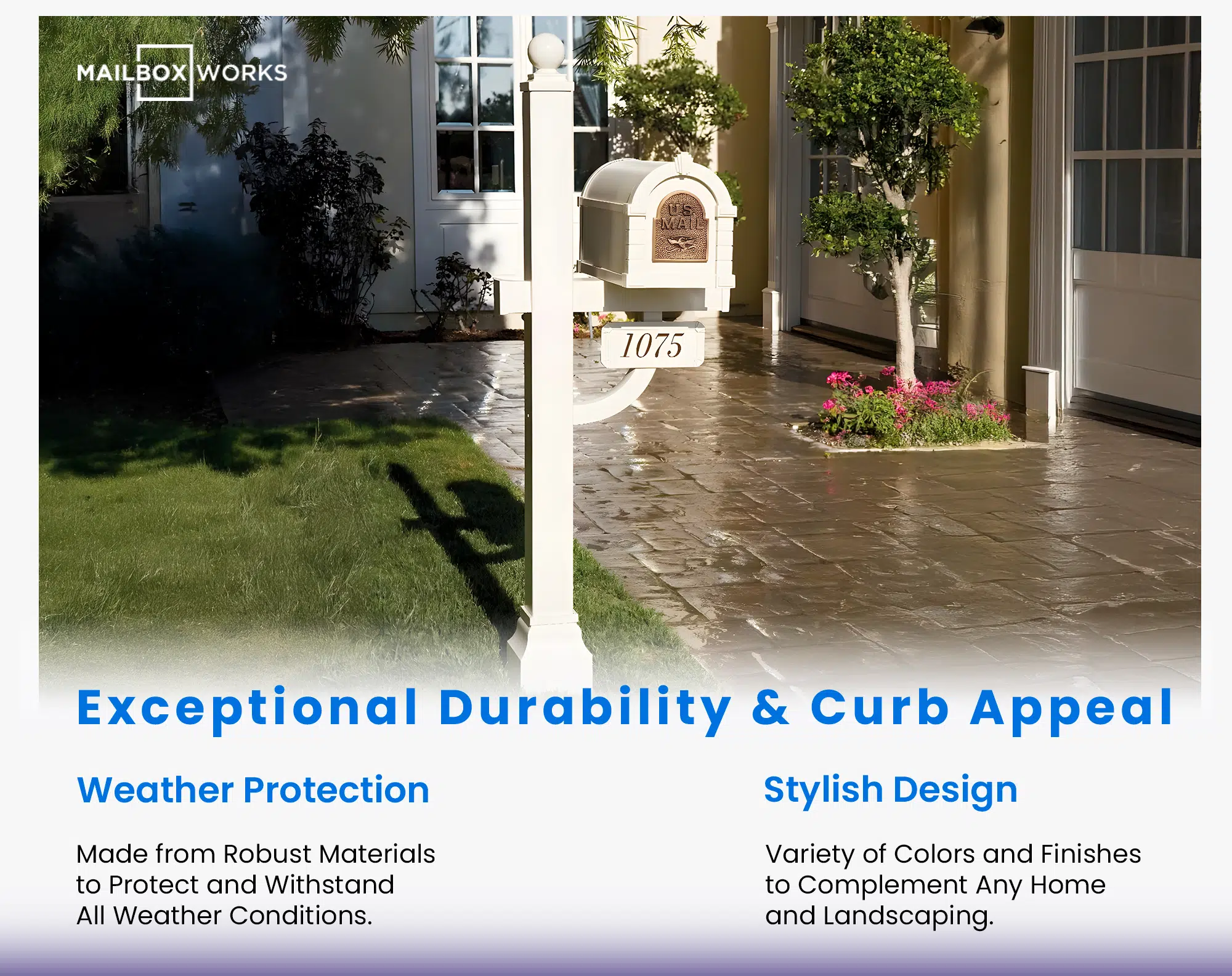 - You can further customize your mailbox by adding your street name and address to the side of the mailbox in a 7 year guaranteed vinyl that will match the color of the mailbox’s accents
