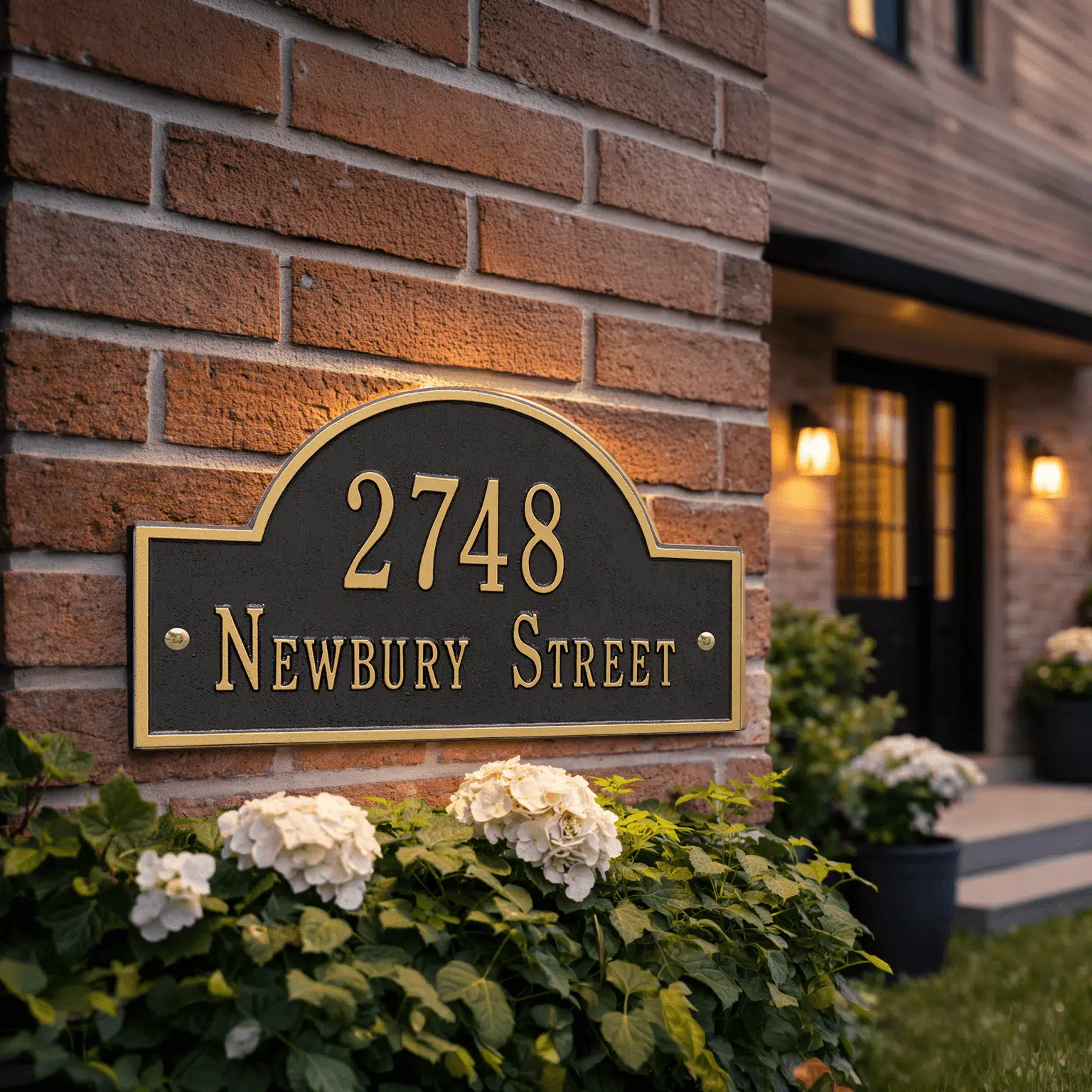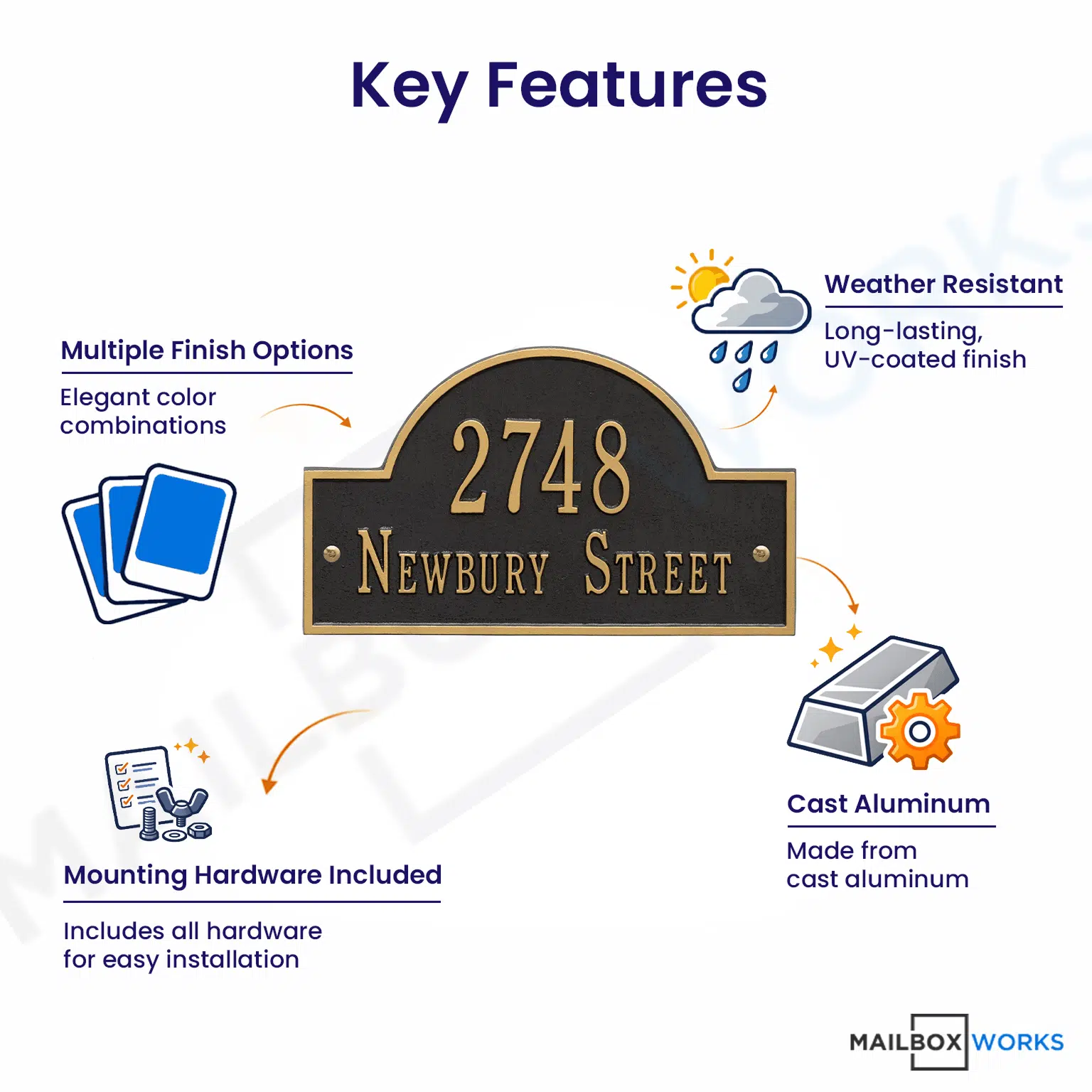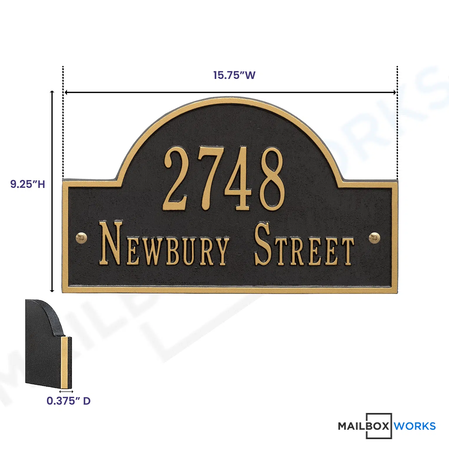 Buy this elegant cast aluminum Whitehall arch marker address plaque with a heavy-duty powder-coated finish to protect your house address numbers in any kind of weather conditions.