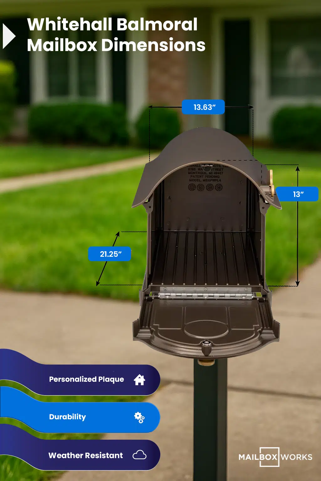 The Whitehall Balmoral Mailbox has 3 times the capacity of a standard post mount mailbox, combining classic mailbox lines with super functionality.
