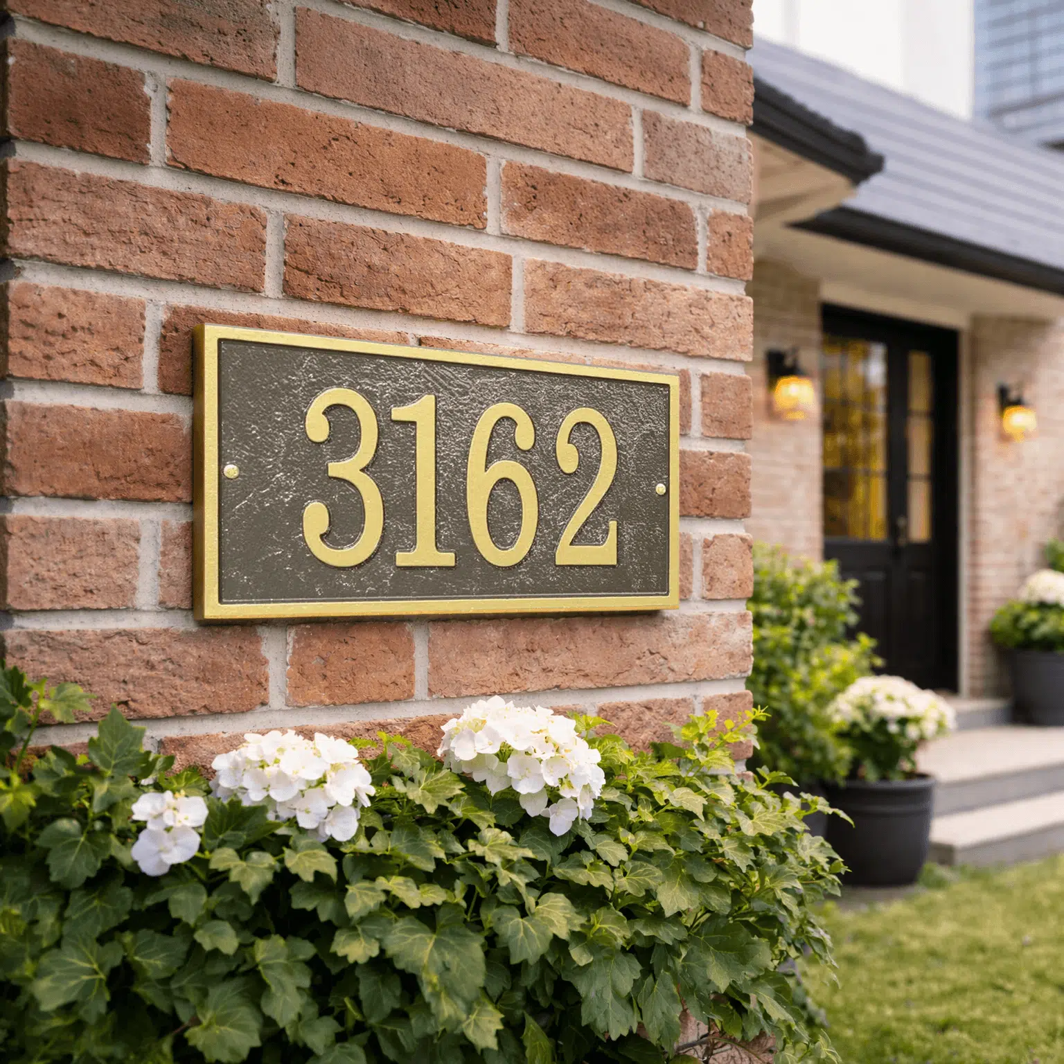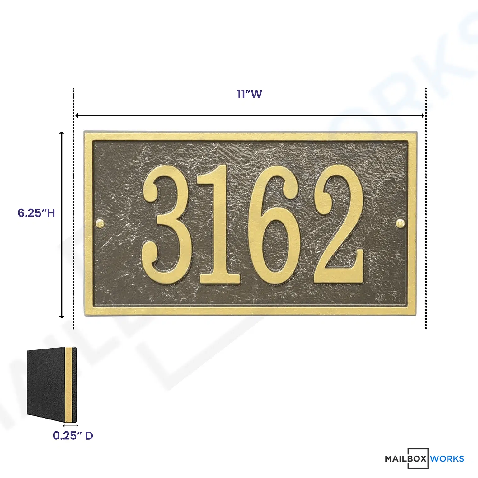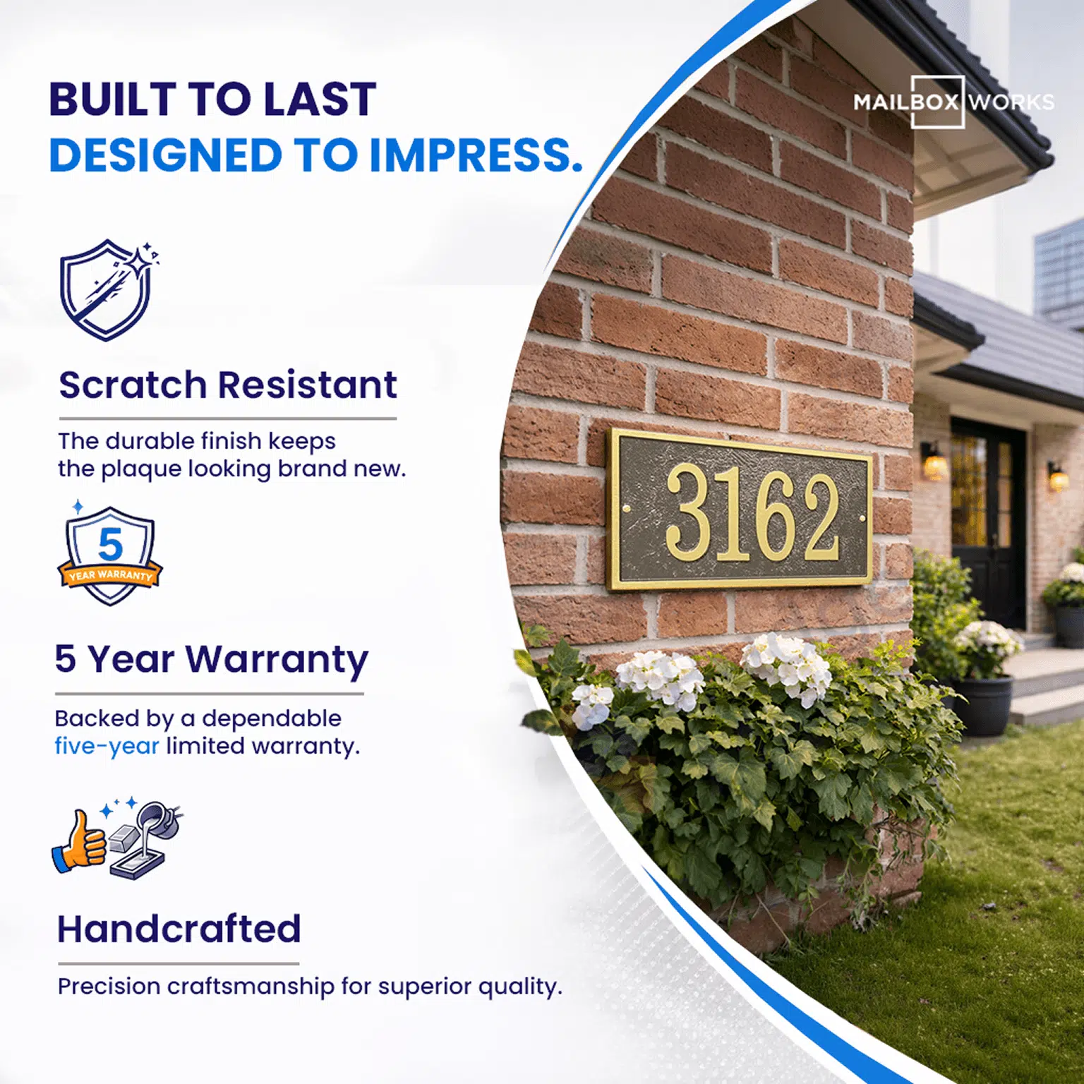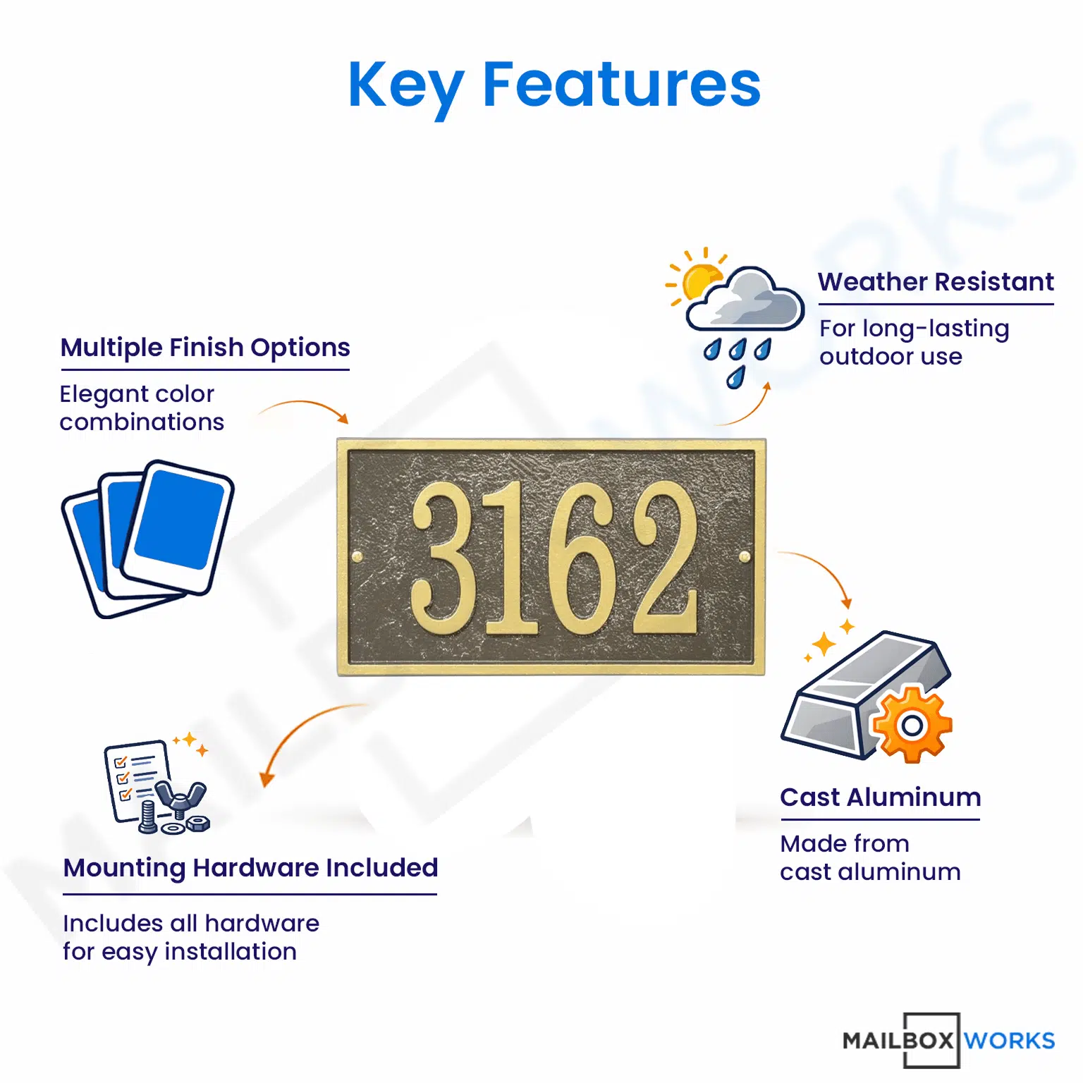 - Choose from 4 different super durable all-weather powder coat colors for this distinctive cast aluminum personalized house numbers address plaque.