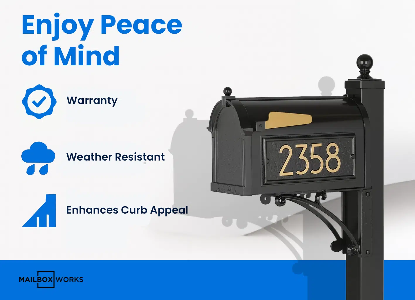Built to Brave the Elements: Our mailbox is more than a pretty face. It’s engineered to resist rust, fading, and corrosion, maintaining its functionality and charm even under harsh weather conditions. Rest assured, the Whitehall Modern Capitol Mailbox is a reliable and stylish choice for your home.